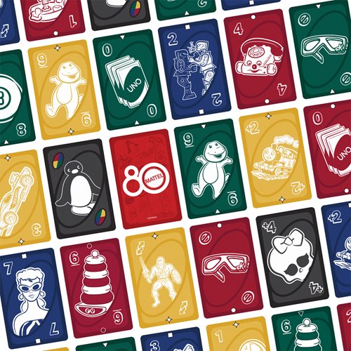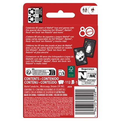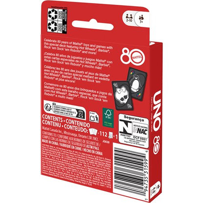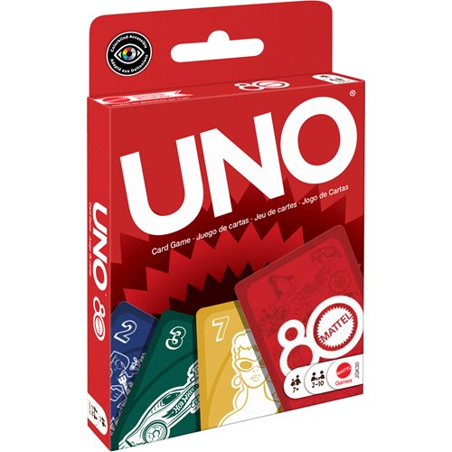 Fans of the great toys and games Mattel has made over the years will love playing UNO Mattel 80th Ruby Red card game. With a deck featuring graphics inspired by Mattel products, players try to match colors and numbers just like the classic game! And when down to a last card, don't forget to yell "UNO!" Makes a great gift for fans of Mattel toys and games and card game lovers ages 7 years old and up.